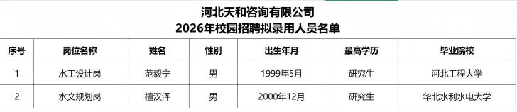 河北天和咨询有限公司2026年度校园招聘拟录用人员公示