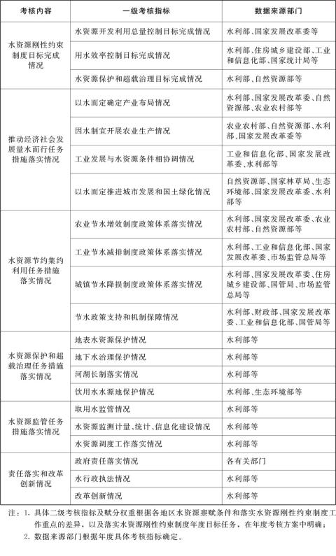 第二条 本办法适用于对各省(自治区、直辖市)人民政府落实水资源刚性约束制度情况的考核。 第三条 考核工作应坚持目标导向、问题导向,科学设置考核指标;坚持依法依规、精简高效,简化优化考核内容;坚持以考促干、注重实效,强化考核结果运用。 第四条 水利部会同国家发展改革委、工业和信息化部、财政部、自然资源部、生态环境部、住房城乡建设部、农业农村部、市场监管总局、国家统计局、国管局等部门组成考核工作组,负责具体组织实施。 第五条 考核内容为水资源刚性约束制度目标完成情况,推动经济社会发展量水而行、水资源节约集约利用、水资源保护和超载治理、水资源监管等任务措施落实情况,以及责任落实和改革创新情况。考核内容及一级考核指标见附件。 第六条 考核评定采用评分法,满分为100分。考核结果划分为优秀、良好、合格、不合格四个等级。考核得分90分以上为优秀,80分以上90分以下为良好,60分以上80分以下为合格,60分以下为不合格。(以上包括本数,以下不包括本数) 第七条 考核每年开展一次,水利部会同考核工作组其他成员单位制定年度考核方案及指标评分细则。 第八条 各省(自治区、直辖市)人民政府按照年度考核方案开展自评,按时将本地区上年度的自评报告报国务院,并抄送考核工作组各成员单位。 第九条 考核工作组各成员单位按照年度考核方案和工作职责对各省(自治区、直辖市)进行核查评分,并充分运用信息化手段和日常监管掌握的情况,提升考核效能,切实减轻基层负担。进行实地核验的,严格按照有关规定执行。 第十条 水利部结合地方自评,根据考核工作组各成员单位的核查评分进行综合评价,提出考核等级建议,形成年度考核结果,并会同有关部门于每年6月底前将上一年度考核结果报国务院审定。 第十一条 年度考核结果经国务院审定后,由水利部向各省(自治区、直辖市)人民政府反馈,并向社会公告。 第十二条 经国务院审定的年度考核结果,交由干部主管部门作为对各省(自治区、直辖市)人民政府主要负责人和领导班子综合考核评价的重要参考。同时,水利部将考核结果作为安排有关中央资金的重要参考依据。 第十三条 对在落实水资源刚性约束制度工作中取得显著成绩的单位和个人,按照国家有关规定在有关表彰奖励中给予考虑。考核结果为不合格的省(自治区、直辖市)人民政府,要在考核结果公告后一个月内,提出限期整改措施,向国务院作出书面报告,并抄送考核工作组各成员单位。考核中发现或整改中出现重大失职失责情况的,依规依纪依法对有关单位和个人予以问责追责。 第十四条 对考核发现的具体问题,考核工作组各成员单位按照工作职责,督促相关省(自治区、直辖市)限期整改。对整改不力的,采取函告、通报、约谈等措施加强督促整改。问题整改情况纳入下一年度考核。 第十五条 在考核工作中存在徇私舞弊、谎报瞒报、篡改数据、伪造资料等行为,造成考核结果严重失真失实的,有关省(自治区、直辖市)考核结果直接确定为不合格,并按照有关规定严肃追究相关单位和人员责任。 第十六条 考核工作严格落实党中央关于整治形式主义为基层减负的有关要求。考核工作人员严格执行中央八项规定及其实施细则精神,遵守考核工作纪律,严禁滥用职权、以权谋私。对违反纪律的,依规依纪依法问责追责。 第十七条 本办法由水利部负责解释。 第十八条 本办法自印发之日起施行。2013年1月2日经国务院同意、由国务院办公厅印发的《实行最严格水资源管理制度考核办法》(国办发〔2013〕2号)同时废止。 附件:落实水资源刚性约束制度考核内容与指标
